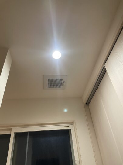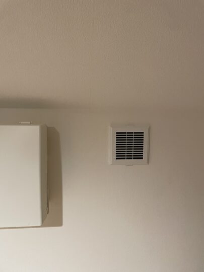 今回の2階の一種換気システム化したことで、以前行った1階と小屋裏部屋をカウンターアローファンで繋げたこともあり、1Fトイレは自動でON/OFFするタイプに変更済みで、1F浴室は換気扇常時OFFでも問題がなくなりました。脱衣室から小屋裏に空気が引っ張られ、小屋裏部屋で熱交換するため、湿度が高い空気でも問題なく処理してくれます。
