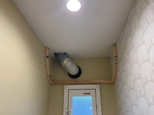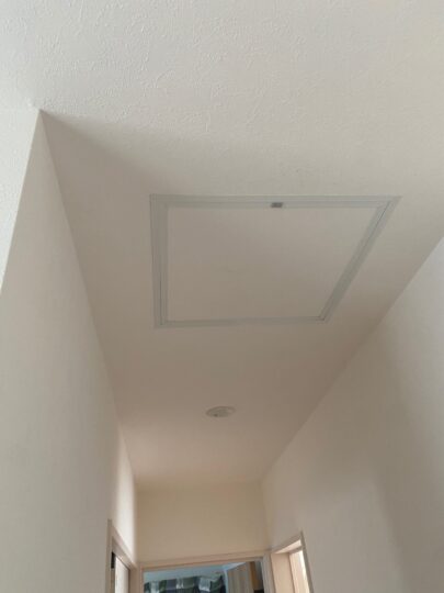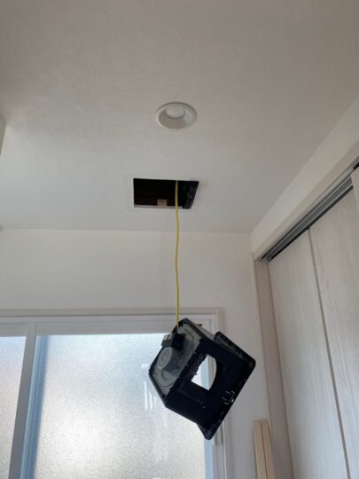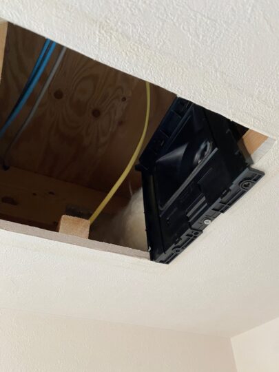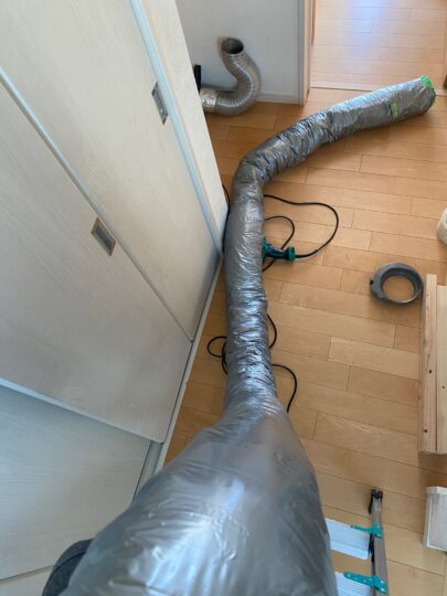 - 点検口の増設: すでに石膏ボードやクロスが貼られているため、新たに2か所の天井点検口を設置し、そこから体を入れてダクトを這わせました。