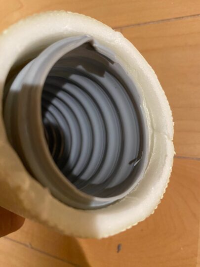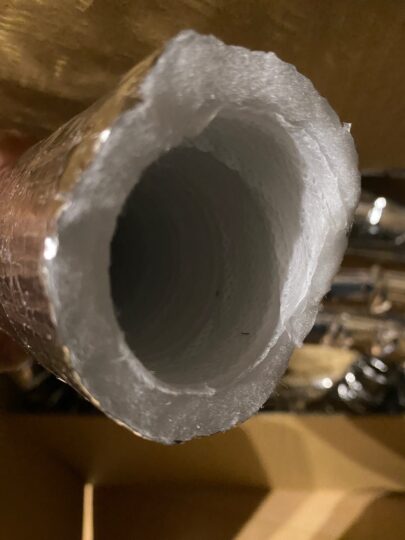 断熱ダクトは断熱がメインですので、内側の素材は音が反響します。これは中古で安く買ったものですが、安価なダクトでした。