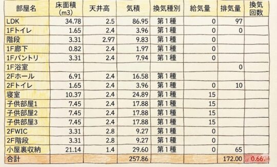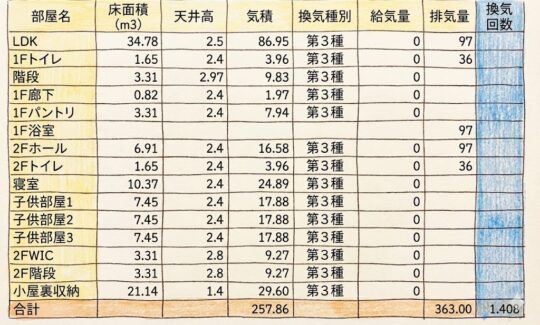 我が家の当初の換気計画ではトイレ2箇所と1F浴室、2F廊下の4箇所での排気でしたが、住んでみるとキッチンの換気扇をどうしても消せなかったです。結局、換気回数は1.41回と大幅に増加し、無駄に家の中の空気を捨てている状態でした。