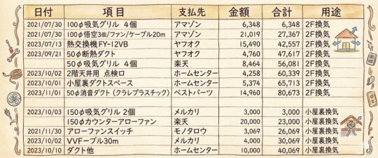 新築時に全館空調を入れたら50万円では済みませんね。今回は中古でちょうど格安で出ていた一種換気システム本体を購入しましたので、それに合わせて部材を合わせて購入しました。ダクトも一部中古で揃えたり、失敗しても痛くないようなるべく出費を抑えて進めた結果です。