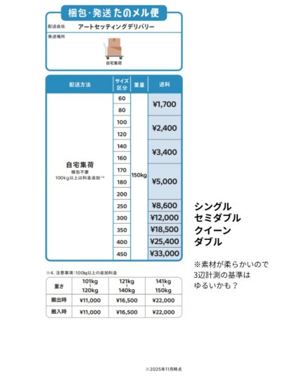 逆に圧縮しない場合はシングルサイズでも195cm×97cm×21cmと300サイズをオーバーしてしまいます。必ず丸めてもらいましょう。