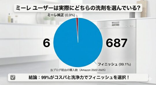 - 結論: ミーレ自体の「高温洗浄」と「強力な水圧」が凄すぎるので、洗剤で背伸びする必要はありません。1回約25円のフィニッシュで、家計を賢く守りましょう。