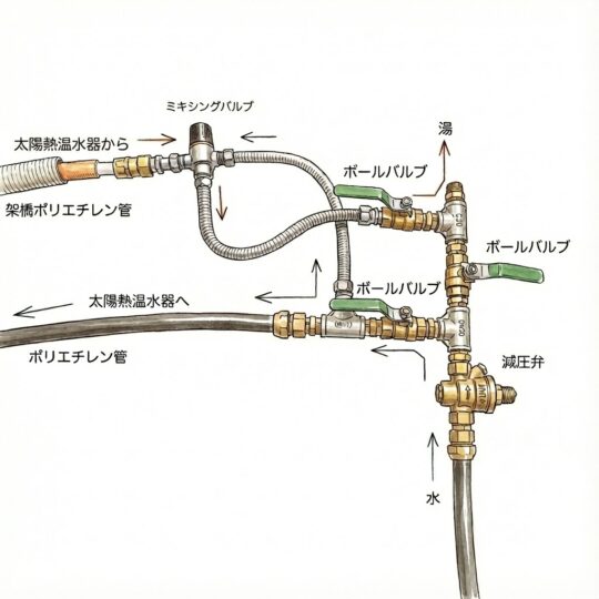 何度シールテープを巻いたことかわかりません。ソーラー接続ユニットと、逆止弁で57,000円と、費用の大半を占めています。普通のミキシング弁で良かったかな、とも思いますが、リンナイの給湯器と組み合わせると、給湯器の設定温度以上で自動的にコントロールしてくれるので満足しています。
